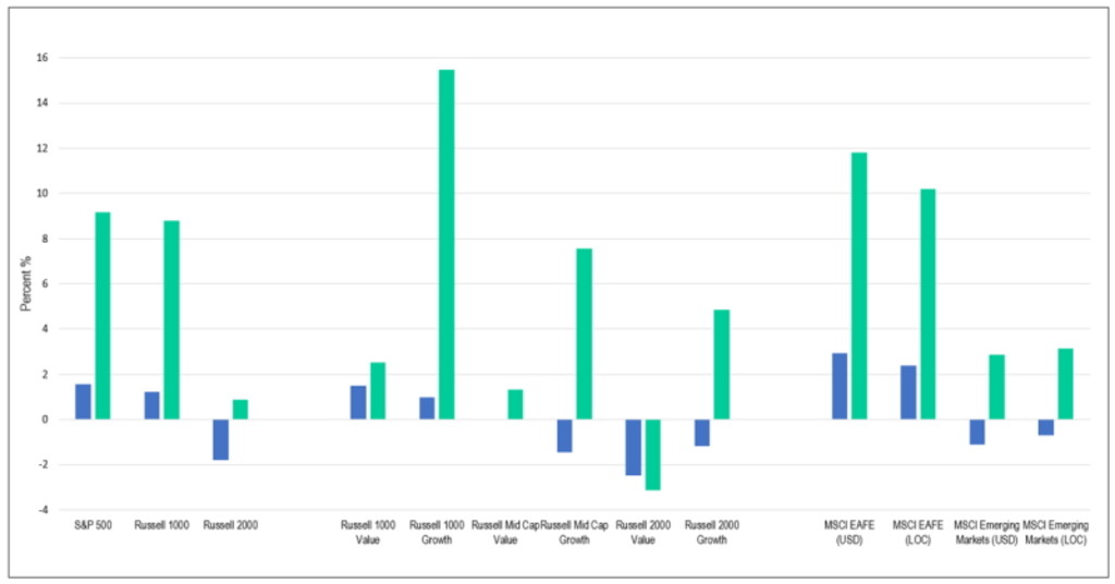 Value vs. growth in aprile (linee blu) e da inizio anno (linee verdi): lo stile growth ha avuto la meglio nel 2023. Fonte: Bloomberg