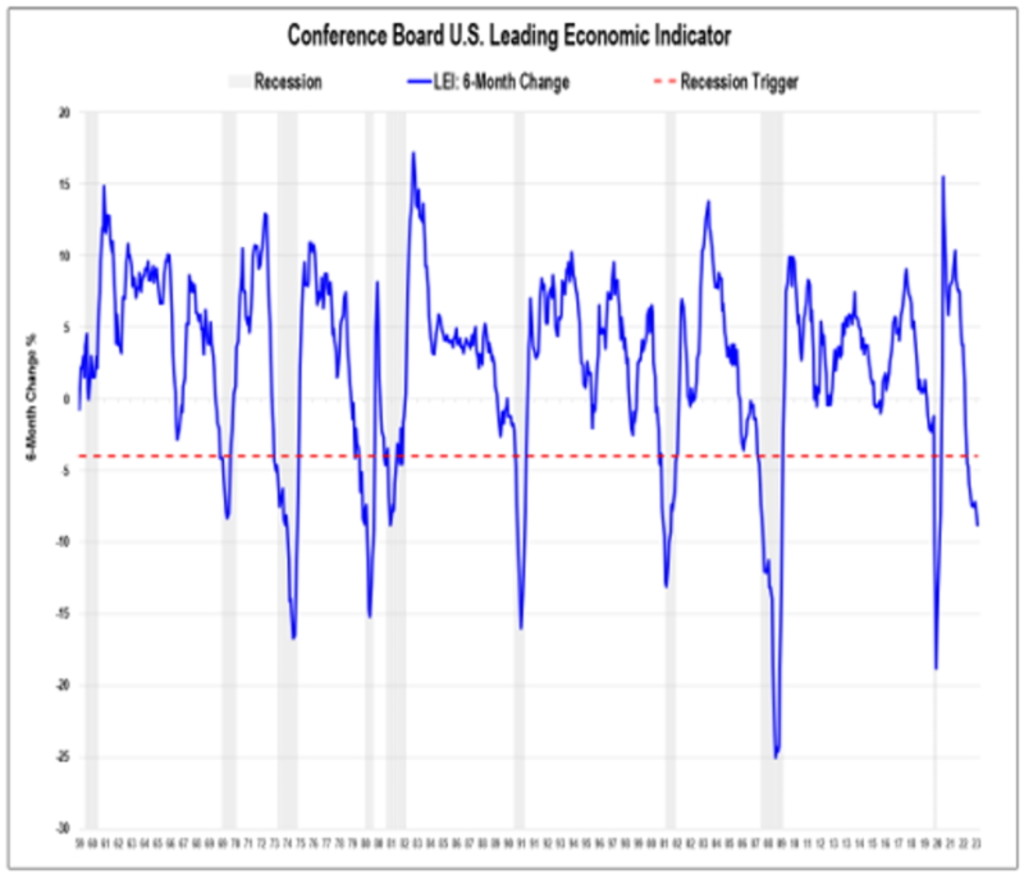 “Il terzo fattore è rappresentato dagli indicatori anticipatori del Conference Board, una serie di dieci indicatori sottostanti che è in calo dell’8% anno su anno in termini annualizzati su sei mesi. In passato una flessione del 4% ha innescato una recessione, e ora siamo al doppio di questo livello.”