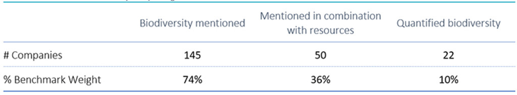- 74% of benchmark companies mention biodiversity in their reporting