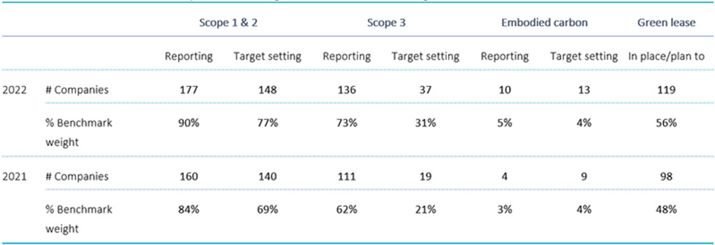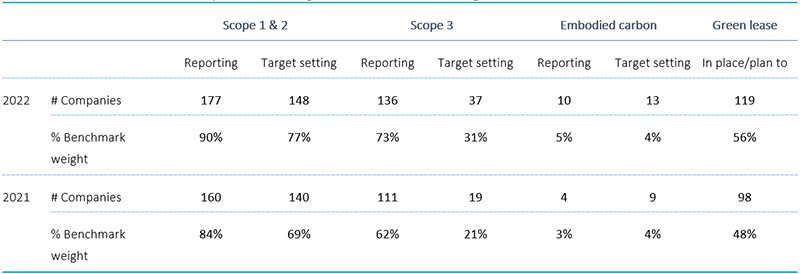 It is reassuring to see that in 2022, real estate companies in our sample improved GHG emissions disclosure and targets, especially for Scope 3. Our sample companies account for 89.5% of the weight in the S&P Global Developed Property Index, and around USD 1.6 trillion in terms of market cap.