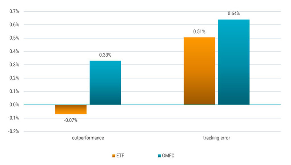 Source: Robeco, Bloomberg, July 2015-June 2024. Performance figures for Robeco QI Global Multi-Factor Credits IH EUR (GMFC), iShares iBoxx $ Investment Grade Corporate Bond ETF (LQD) and iShares Broad USD Investment Grade Corporate Bond ETF (USIG). The performance figures for LQD and USIG are averaged to show the aggregate ETF performance. To determine gross of fees returns, we add the total expense ratios of the ETFs to their net returns. This ensures a like-for-like comparison with the gross-of-fees returns of our Multi-Factor Credits strategy. To calculate the tracking error, we use NAV-returns, again to ensure a like-for-like comparison with Robeco QI Global Multi-Factor Credits.