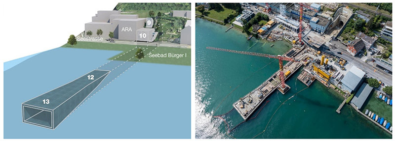 Modello elaborato al computer (a sinistra) e cantiere (a destra) di un tunnel sotterraneo che convoglierà le acque piovane dal fiume Sihl al lago di Zurigo. Fonte: Cantone di Zurigo, Wasserbauprojekte. Febbraio 2025.