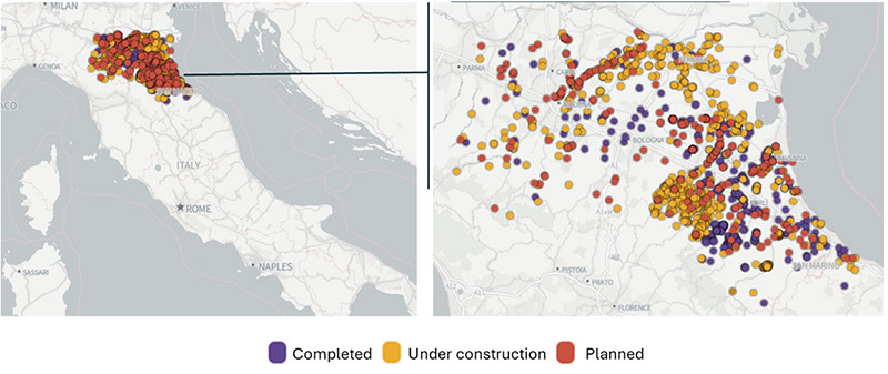 In diverse regioni d’Italia le forti piogge e le inondazioni stanno diventando un problema cronico. La città di Bologna e la provincia di Ravenna in Emilia-Romagna sono le ultime aree, in ordine di tempo, ad aver subito gravi danni a causa delle alluvioni causate dalle forti precipitazioni. In risposta a una serie di perturbazioni, l’ultima delle quali si è abbattuta sull’Emilia-Romagna nel settembre 2024, le autorità regionali stanno investendo 1,2 miliardi di euro in oltre 100 progetti destinati a ripristinare le reti idriche collassate e a costruire infrastrutture per gestire le acque piovane al fine di prevenire alluvioni e danni in futuro. I progetti comprendono la costruzione di muri di contenimento e di nuovi argini, l’ampiamento dei bacini di raccolta e dei canali e l’installazione di paratoie per intercettare il materiale trasportato dai fiumi. 1