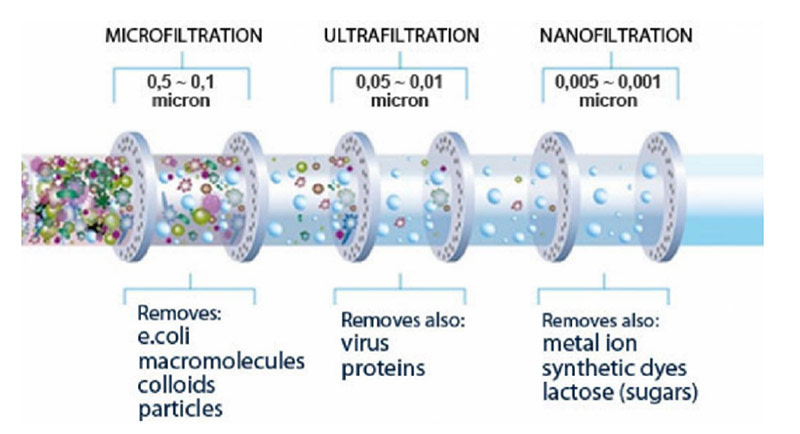 Il metodo convenzionale di trattamento delle acque (membrane di microfiltrazione, a sinistra) può rimuovere dalle forniture idriche le macroparticelle più grandi. Per eliminare inquinanti industriali sempre più complessi servono sistemi di filtrazione più sofisticati (nanofiltrazione, a destra). Fonte: Lubron UK. Marzo 2025.