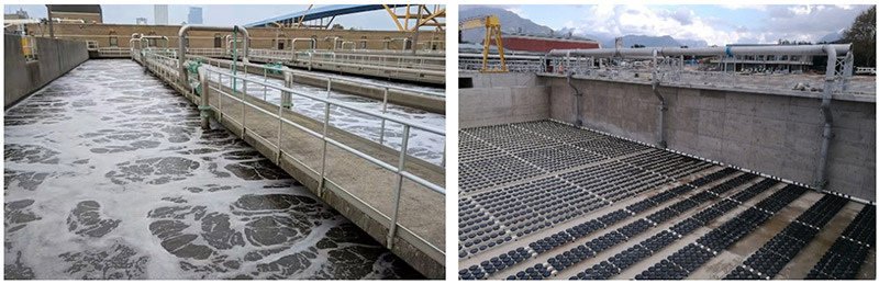 Esempi di vasche di aerazione per acque reflue, piene e vuote. Il trattamento delle acque reflue si articola in diverse fasi, che richiedono molti tipi di infrastrutture tecniche. Fonte: Wastewater Digest, SA Five Engineering, Veolia, Febbraio 2025.
