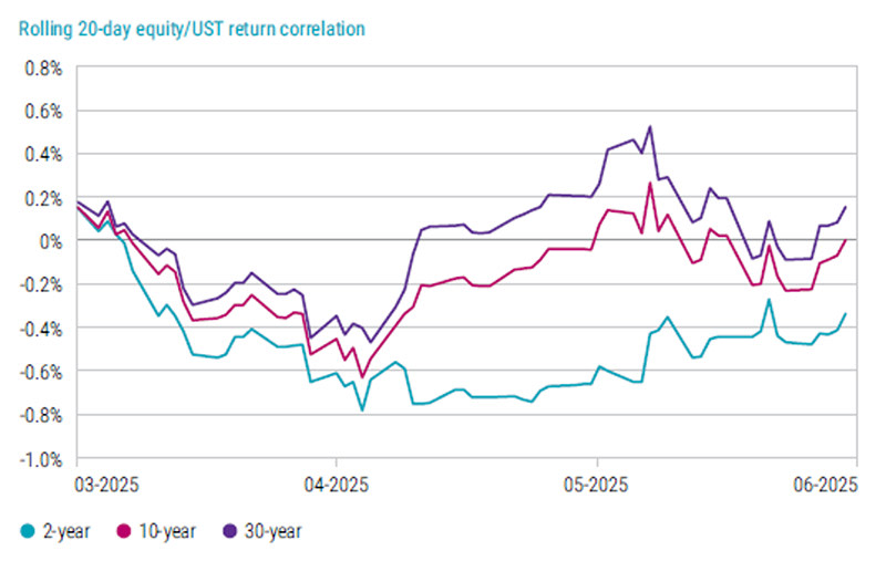 In fact, the correlation between equity and bond returns turned from negative to positive. Interestingly, the equity/bond correlation for 2-year Treasuries remained negative (see Figure 2 below), indicating that short-term bonds continued to act as safe havens. This is somewhat surprising, given that the trade tariffs announced in early April – though temporarily inflationary – would have been expected to impact shorter maturities more severely.