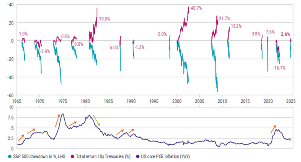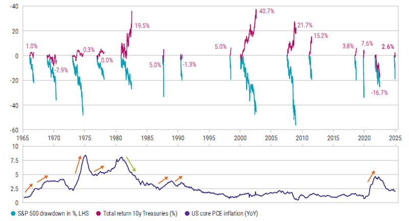 To assess whether the safe-haven status of US Treasuries has truly been compromised, we began by compiling an overview of historical equity market corrections exceeding 15% over the past 60 years. We then analyzed the performance of 10-year Treasuries during these corrections. Figure 1 below illustrates a total return of approximately 2.5% during the nearly 20% correction in the S&P 500 that began in February 2025 and ended on 9 April.