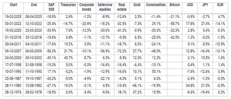 It’s not just US Treasuries that can act as a safe haven of course. Gold has been considered one for centuries. Other asset classes include highly rated corporate bonds, defensive equities and fiat currencies – but are they reliable? The table below shows asset class returns during major falls in the S&P 500 since the 1970s.