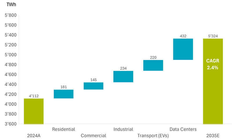 Data centers / AI computing: Already big users of electricity, data center power consumption is expected to increase at an annual rate of 15% (CAGR) by 2035. Data centers already account for around 3% of the total demand and could well reach 10% by 2035.