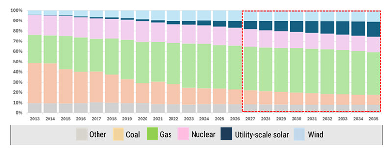 According to the International Energy Agency (IEA), the US energy mix by 2040 could be made of 900 GW of solar, 600 GW of wind, 450 GW of natural gas, 250 GW of battery storage, 100 GW coal and nuclear.9 This mix highlights the need for ‘always-available’ dispatchable power to complement intermittent renewable energy sources.