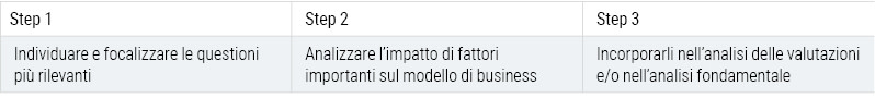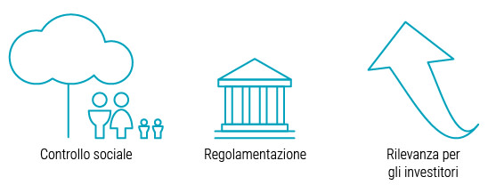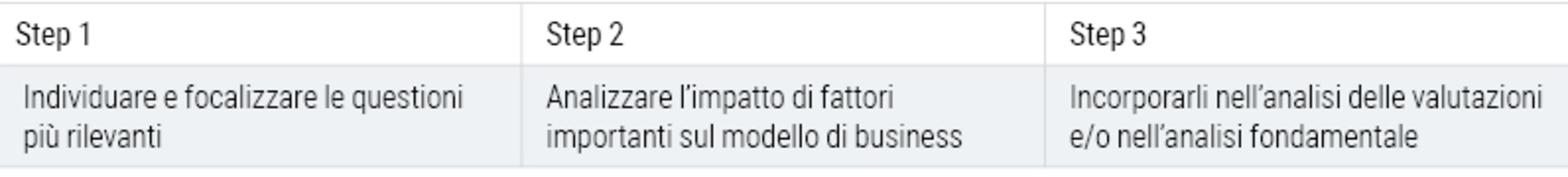 I fattori ambientali comprendono in genere l’inquinamento, lo smaltimento dei rifiuti e, da ultimo, le emissioni di paesi e aziende nel tentativo di contenere il riscaldamento globale. I fattori sociali si concentrano sui diritti umani, sulle problematiche del lavoro e sulla diversità. I fattori di governance spaziano dal garantire una buona gestione delle imprese – attraverso l’assunzione di decisioni a vantaggio di tutti gli azionisti e gli stakeholder e non solo degli amministratori – alla lotta alla corruzione attiva e passiva.