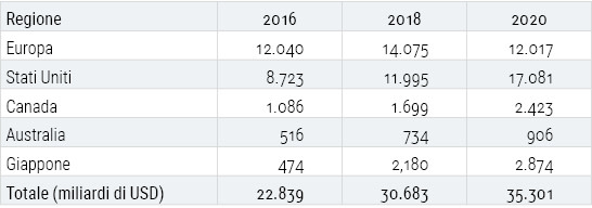 Figura 2: L’aumento degli investimenti sostenibili globali dal 2016 al 2020 in migliaia di miliardi di dollari USA
