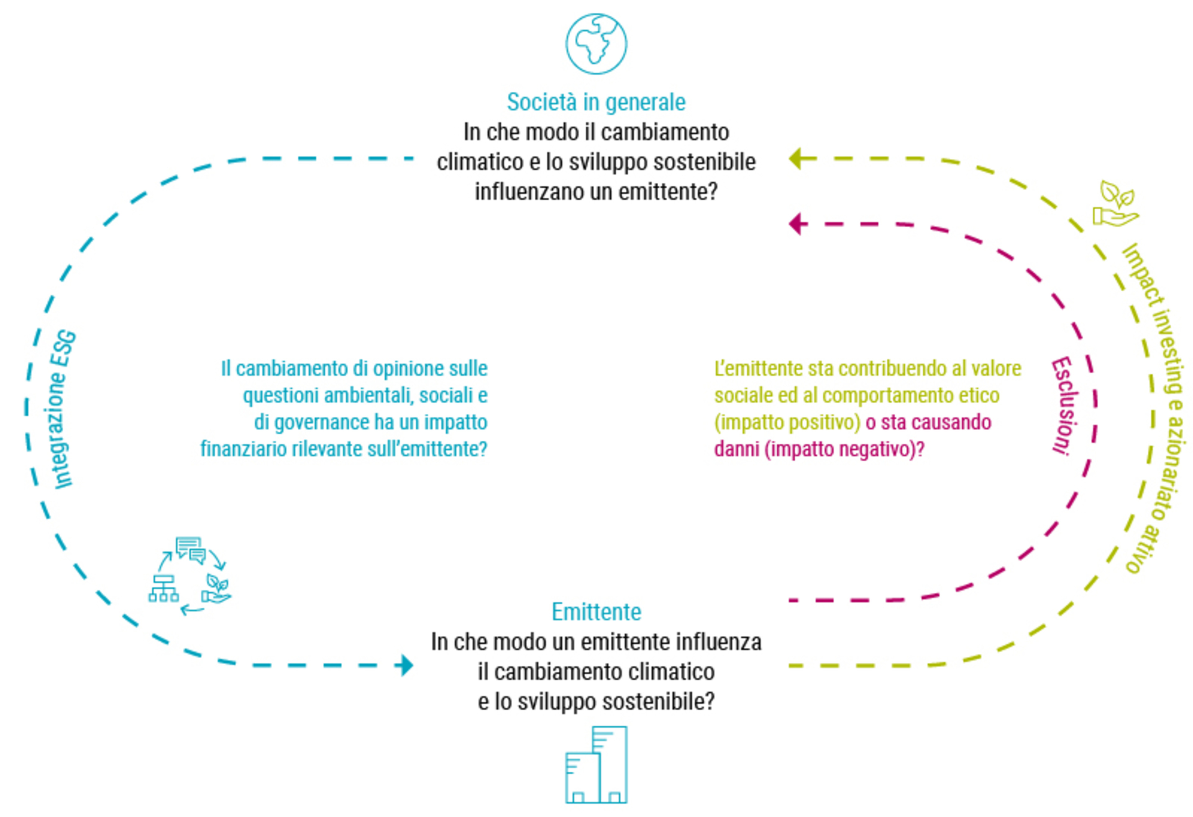 Gli investimenti sostenibili adottano pratiche ESG progressive che possono aumentarne il valore. Inoltre, si utilizza il concetto di doppia rilevanza. Oltre a osservare l’influenza dello sviluppo sostenibile sui modelli di business delle imprese, e quindi sul loro valore finanziario; gli investitori devono anche considerare l’influenza esercitata dall’impresa (o dal paese) sul mondo.
