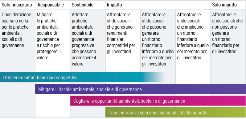 L’impact investing si spinge ancora oltre e mira a investimenti che producono effetti diretti e tangibili, senza generare necessariamente un rendimento finanziario superiore, a seconda dell’obiettivo. Le differenze principali tra questi stili sono illustrate nella figura seguente: