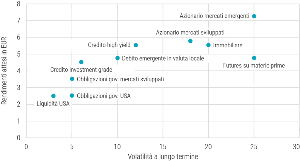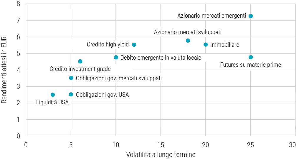 Rendimenti attesi delle asset class vs. volatilità a lungo termine