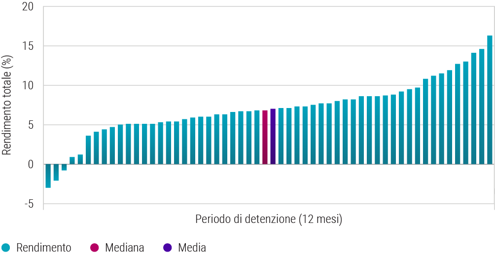 Fonte: Bloomberg, Robeco. Periodo della ricerca: marzo 2001 - dicembre 2023. La figura mostra la distribuzione dei rendimenti totali registrati dall’indice Bloomberg Global Aggregate – Corporates in tutti e 56 i periodi di dodici mesi cominciati con un livello di rendimento compreso tra il 4% e il 5%. I rendimenti totali indicati sono privi di copertura, e la valuta può differire da quella del paese di residenza dell’investitore. A causa delle oscillazioni dei tassi di cambio, i rendimenti totali indicati potrebbero essere superiori o inferiori quando convertiti in valuta locale. I periodi inferiori a un anno non sono annualizzati. Il valore degli investimenti può subire oscillazioni. I rendimenti passati non sono indicativi dei possibili risultati futuri. L’analisi non rappresenta la performance di alcuna particolare strategia di investimento di Robeco ed è presentata a scopo puramente illustrativo.