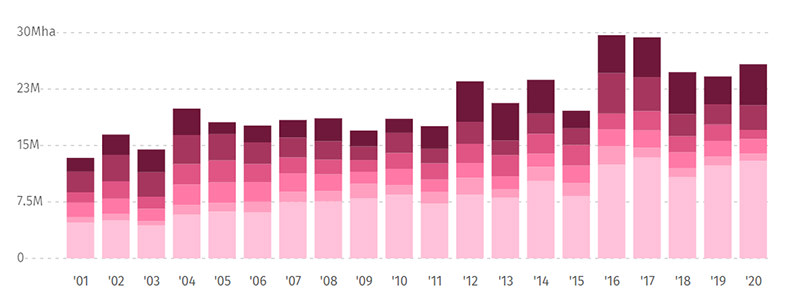 Much deforestation is caused by western consumption: the EU was responsible for 16% of global tree loss due to imports from countries where deforestation is prevalent in 2017, totaling 2,000 square kilometers of land, according to the World Wildlife Fund.5