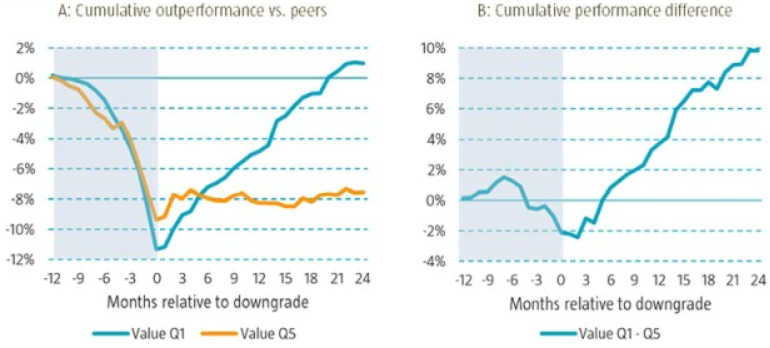 Panel A in Figure 3 shows the cumulative outperformance against peers for these cheap and expensive fallen angels, according to our value factor; Panel B shows the performance difference between the two groups. The cheap fallen angels (Value Q1, blue line) underperform more until the downgrade, after which they start to considerably outperform the more expensive fallen angels (Value Q5, orange line). In fact, the cheap fallen angels perform so well after the downgrade that the event window-return turns positive.