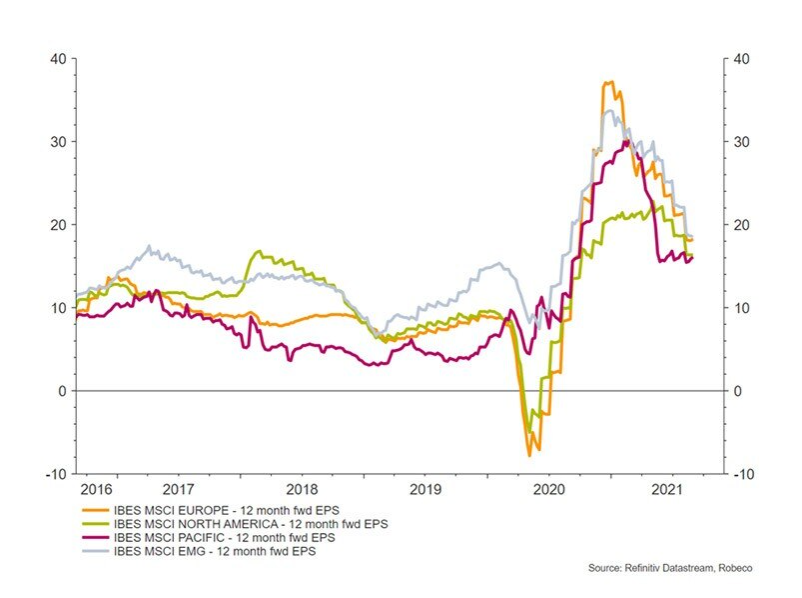 “This view is corroborated by our bottom-up analysis, as corporate analysts are expecting 12-month forward EPS growth in various regions to be close to but below 20% at this point in time. So, the profit party peaks, but the aftermath looks benign.”