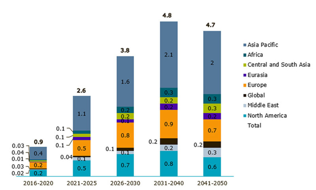 Annual average investment (USD trillions) required for decarbonization across regions, 2021-2050. Source: GFANZ. 3