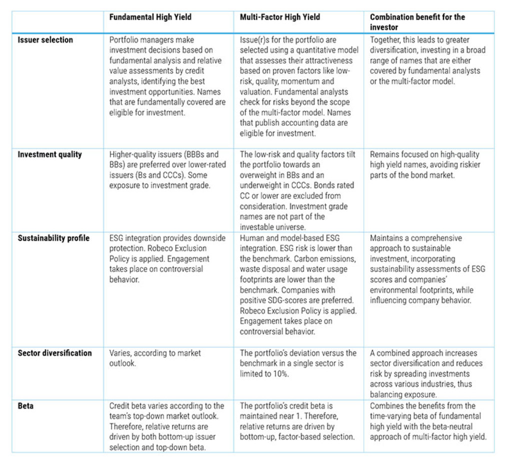 The table below outlines the characteristics of the two strategies—fundamental high yield and multi-factor high yield—and highlights the benefits of combining these approaches.