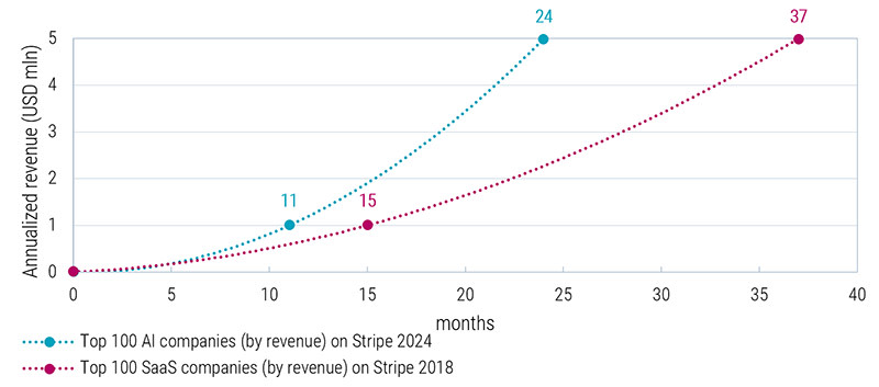 Last year, Stripe processed USD 1.4 trillion in payments, comparable to Adyen, and made several key observations. Their data from 2024 indicates that their AI clients are expanding business at an unprecedented pace. As illustrated in Figure 2, the median time for its top 100 AI companies to reach USD 5 million in annualized revenue is merely 24 months, which is 30-40% faster than Software-as-a-Service (SaaS) companies. This suggests that AI software solutions could impact existing players even more swiftly than the disruptive force of SaaS in the 2010s. Stripe anticipates that these new industry-specific AI tools will enable individual industries to fully harness the economic potential of Large Language Models, with the integration of context, data, and workflows providing lasting value.
