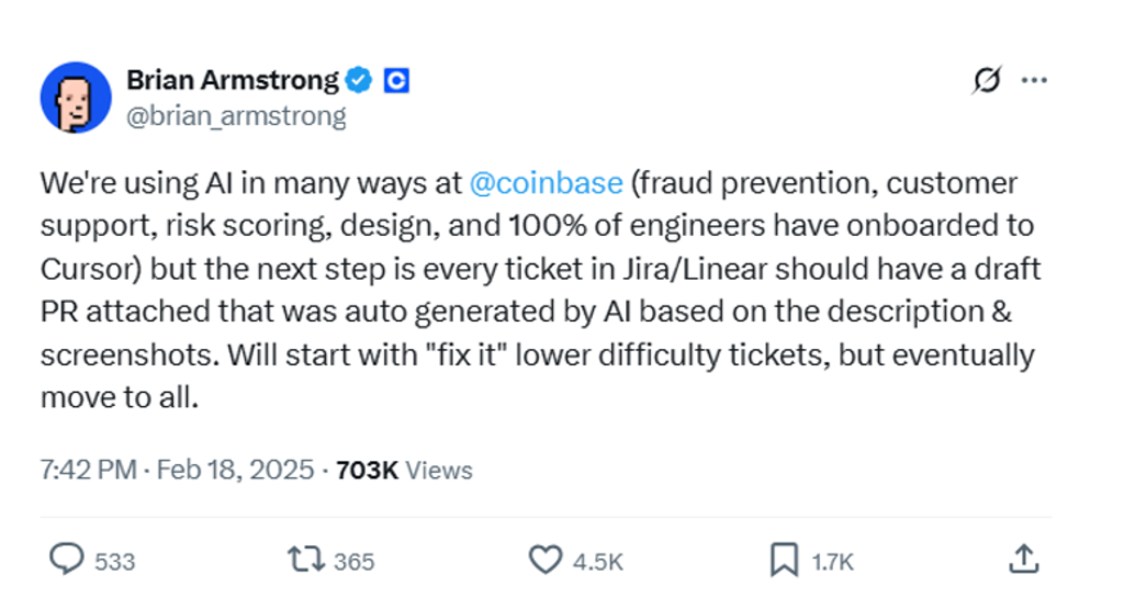 Source: Brian Armstrong, Coinbase CEO, on X, 18 February 2025