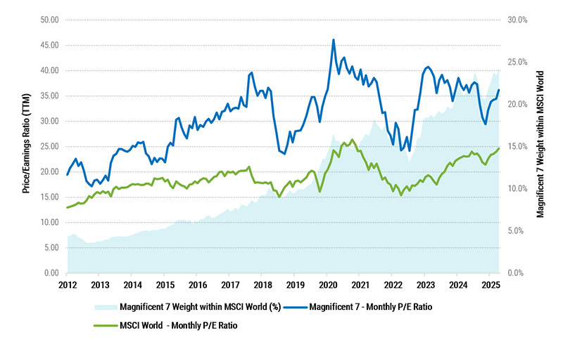 Figure 1: The price/earnings ratios of the Magnificent Seven are much higher than the MSCI World