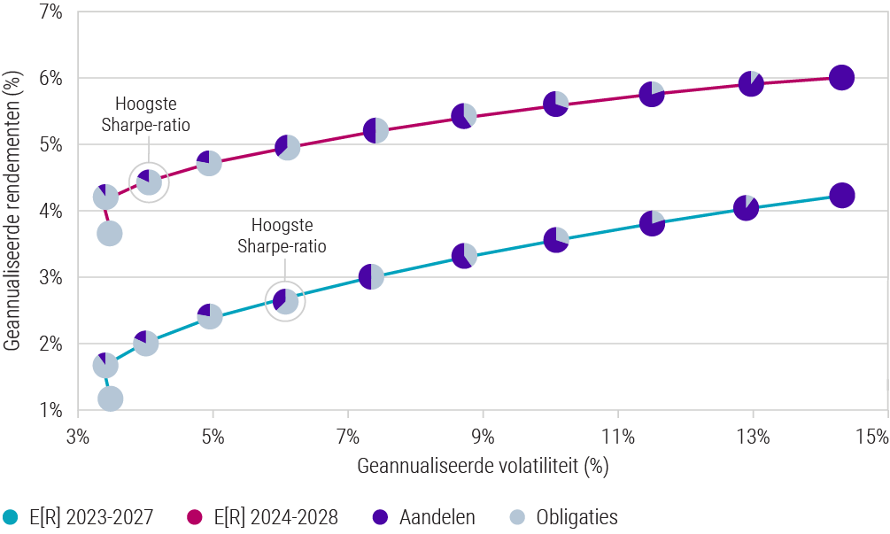 Efficient frontier van obligaties en aandelen voor Expected Returns 2023-27 vs. 2024-28