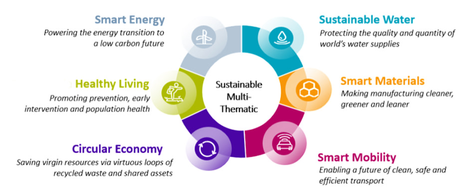 De oplossing was om zes van Robeco's gespecialiseerde duurzame strategieën te combineren die al deze doelstellingen realiseren. Het multi-thematische aanbod omvatte alle drie strategieën in de 'Smart'-reeks gerelateerd aan hernieuwbare energie – Smart Energy, Smart Mobility en Smart Materials – en de strategieën Circular Economy, Sustainable Water en Healthy Living.