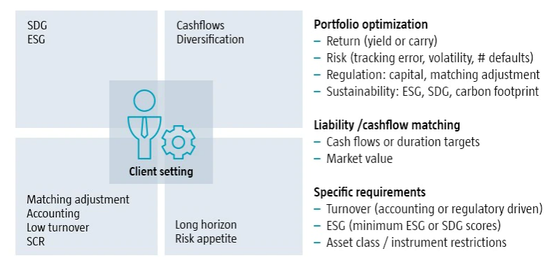 Robeco biedt verzekeraars en pensioenfondsen oplossingen op maat. Deze portefeuilles worden geoptimaliseerd op basis van klantspecifieke doelstellingen voor drie belangrijke aandachtspunten: