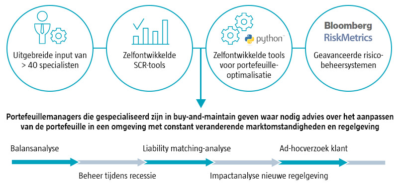We hebben veel ervaring met het beheer van portefeuilles die zijn aangepast aan de specifieke overwegingen van klanten met betrekking tot beleggingen en regelgeving. Ons aanbod is onder meer gericht op liability-driven investments (LDI), cashflowmatching, buy-and-maintain-creditstrategieën en multi-assetoplossingen.