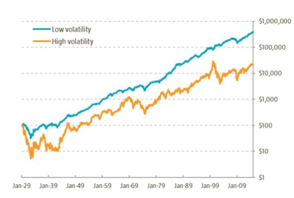 Uit Figuur 1 blijkt dat aandelen met een lage volatiliteit het beter doen dan aandelen met een hoge volatiliteit, terwijl de CAPM-theorie juist het tegenovergestelde voorspelt. Het verschil in rendement op jaarbasis is 4%, en gecorrigeerd voor risico is de alfaspread van het CAPM-model 14%. Wie in 1929 USD 100 investeerde in aandelen met een lage volatiliteit, zou begin 2015 USD 400.000 hebben gehad, terwijl dit bij aandelen met een hoge volatiliteit slechts USD 20.000 zou zijn geweest. Aandelen met een lage volatiliteit brachten dus 20 keer zo veel op als die met een hoge volatiliteit. Het opvallendste is de zeer zwakke performance van aandelen met een hoge volatiliteit.