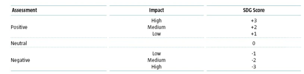 De uitkomst van deze driestappenanalyse wordt gekwantificeerd met een uiteindelijke SDG-score. Dit is te zien in tabel 1.