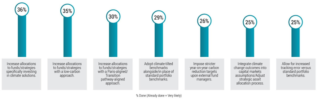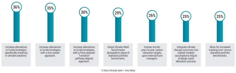 Pursuing net zero has implications for portfolio construction, led by increased demand for low-carbon investment strategies. Some 25% of investors said they are very likely to increase allocations to investment products specifically targeting climate solutions, while 11% have already done so. Similar numbers said they would increase allocations to strategies with a low-carbon approach.