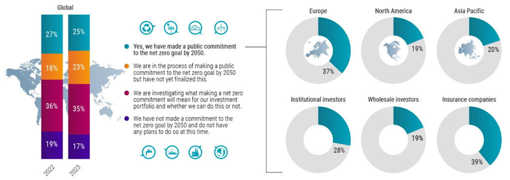 Almost half of investors are progressing their net-zero efforts in some way, rising to a total of 48% from 45% in the 2022 survey. The number of investors who have already committed to making their assets under management carbon neutral by 2050 fell slightly to 25% from 27%, while those who are in the process of committing to doing so rose to 23% from 18%.