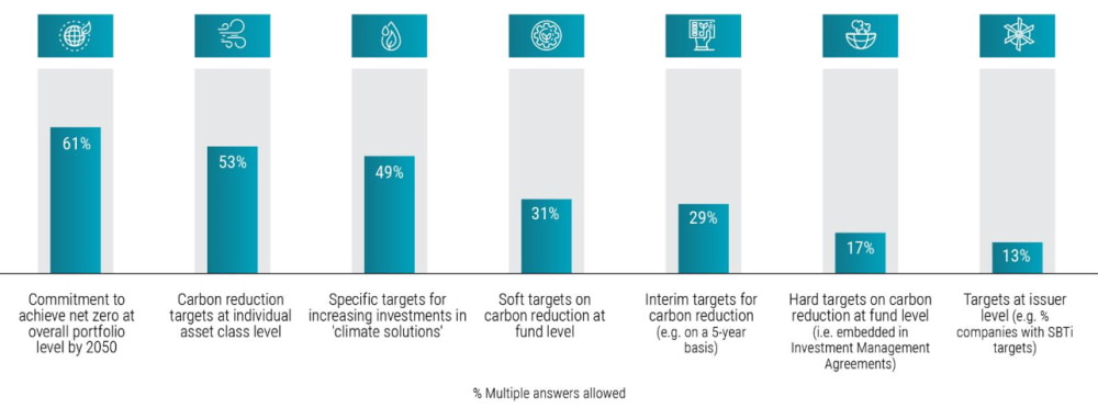 Some 53% of investors said they have set carbon-reduction targets at the asset class level, such as in an equities product. However, only 29% of those making net-zero commitments have put interim targets in place, such as over a five-year term, and only 13% have set targets at the issuer level focusing on the companies themselves.