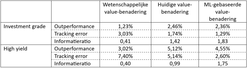 De belangrijkste verbetering van de ML-gebaseerde benadering ten opzichte van de huidige benadering voor de value-factor zit hem in de verlaging van het actieve risico (tracking error). De ML-gebaseerde benadering blinkt uit in het vermijden van value traps in de risicovollere segmenten van de markt, wat resulteert in een kleinere exposure naar de obligaties met het hoogste risico. Binnen investment grade wordt deze actieve risicoreductie bereikt met een iets lagere outperformance dan bij de huidige benadering. Binnen high yield is de outperformance weliswaar lager, maar de ML-gebaseerde benadering zorgt wel voor een forse verlaging van het actieve risico. Dat leidt tot een flink hogere risicogecorrigeerde performance voor de strategie, zoals aangegeven door de informatieratio. Dit onderstreept het vermogen van de ML-gebaseerde value-factor om een aantrekkelijke outperformance te realiseren bij een bescheiden risiconiveau.
