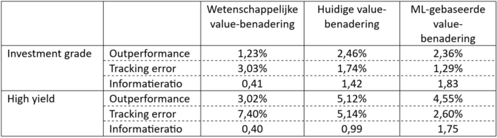 Onderstaande tabel toont de onderzoeksresultaten voor een wereldwijd universum van bedrijfsobligaties over de onderzoeksperiode van 1994 tot 2022. In de tabel staan de gebackteste outperformance, het actieve risico (tracking error) en de risico-rendementsverhouding (informatieratio) van de wetenschappelijke benadering voor de value-factor, de huidige benadering van Robeco en de ML-gebaseerde benadering.