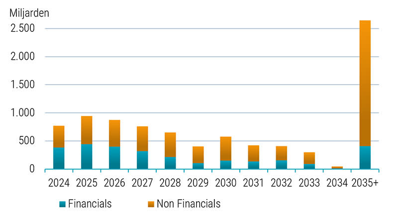Dit is ook te zien in Figuur 3 hieronder, waar de uitstaande schuld van Amerikaanse investmentgradebedrijven (financials en corporates) is weergegeven. Een groot deel van de uitstaande schuld heeft een looptijd tot het jaar 2035 of daarna en dus hoeven veel investmentgradebedrijven pas over tien jaar of later te herfinancieren. Voor deze bedrijven zal de hogere rente de komende tijd dan ook nog niet leiden tot hogere rentekosten.