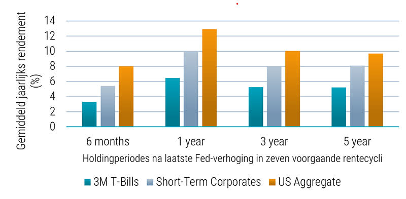 Geldmarktfondsen en kortlopende staatsobligaties worden gezien als een lucratieve plek om geld te parkeren, tegen een rente van meer dan 4%. Toch leert de geschiedenis ons dat deze instrumenten niet de beste plaats zijn op het moment dat centrale banken overstappen op een verruimend beleid. Dit wordt geïllustreerd in Figuur 2 hieronder, waarin de performance van kortlopende bedrijfsobligaties wordt afgezet tegen geldmarktbeleggingen en langerlopende geaggregeerde obligaties in perioden na de laatste renteverhoging door de Amerikaanse Federal Reserve (Fed).