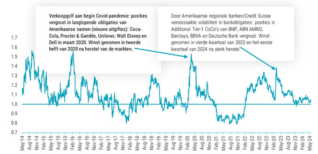 Deze contraire benadering is diep verankerd in onze beleggingsstrategie en gaat verder dan risicoaanpassingen op portefeuilleniveau voor individuele effecten. Als bedrijfsobligaties verzwakken door te heftige reacties van de markt, bijvoorbeeld op winstwaarschuwingen, zien wij dat als een potentiële koopkans – op voorwaarde dat ons creditonderzoek geen value traps aan het licht brengt. Op een vergelijkbare manier verkleinen we onze exposure als de koersen van bedrijfsobligaties door buitensporig optimisme overgewaardeerd raken.