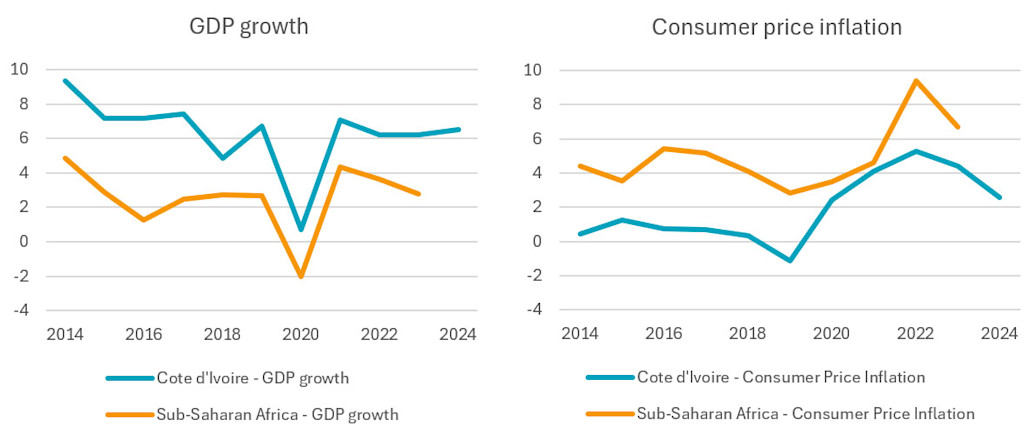 Ivory Coast has evolved into an economic powerhouse in the past decade, blasting past its Sub-Saharan peers. Between 2012-2019, Ivory Coast averaged a stunning 8.2% GDP growth against a global average of just under 3%. With 6.1% GDP growth in 2024, stunning growth is back on track, with inflation also in check.