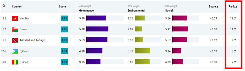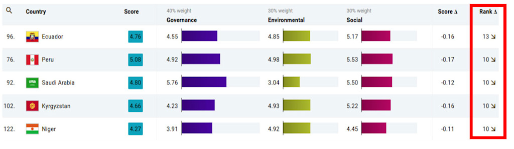 Both the US and Japan, the world's largest sovereign debt issuers, gained ground. Despite a decrease in its governance score, the US improved its all-around country score. However, those results are subject to change given many of the drastic policy shifts (and reversals) of the Trump administration were announced in late spring – too late to be reflected in current country scores.