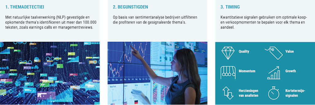 Het beleggingsproces van Dynamic Theme Machine bestaat uit drie delen. Eerst signaleren we thema's uit een enorme hoeveelheid data, waaronder earnings calls van bedrijven, nieuwsartikelen en gesprekken met managementteams, aan de hand van een vorm van AI die natuurlijke taalverwerking wordt genoemd. Ten tweede passen we sentimentanalyse toe – een proces dat op basis van de gekozen woordenschat beoordeelt of een tekst positief, negatief of neutraal is – om de meest aantrekkelijke bedrijven te selecteren. Ten derde kopen we aan de hand van Robeco's kwantitatieve modellen de geselecteerde thema's en de bedrijven die daarvan profiteren.