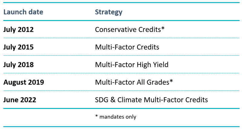 Our first standalone factor credit portfolio was launched a decade ago, in 2012. Today, Robeco’s factor credits capability oversees nearly EUR 5 billion in assets under management, across 15 live portfolios.