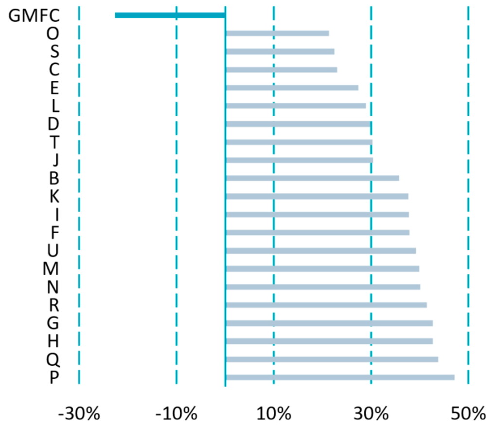 Source: Morningstar Direct, Bloomberg, Robeco. Period: July 2015-June 2021. GMFC = Robeco QI Global Multi-Factor Credits (EUR-hedged) live track-record. B to U are 20 anonymized global credit funds (all euro hedged). Outperformance is calculated vs. Bloomberg Global Aggregate Corporates (euro hedged). The currency in which the past performance is displayed may differ from the currency of your country of residence. Due to exchange rate fluctuations the performance shown may increase or decrease if converted into your local currency. The value of your investments may fluctuate. Past performance is no guarantee of future results. Performance gross of fees, based on gross asset value. In reality, costs (such as management fees and other costs) are charged.