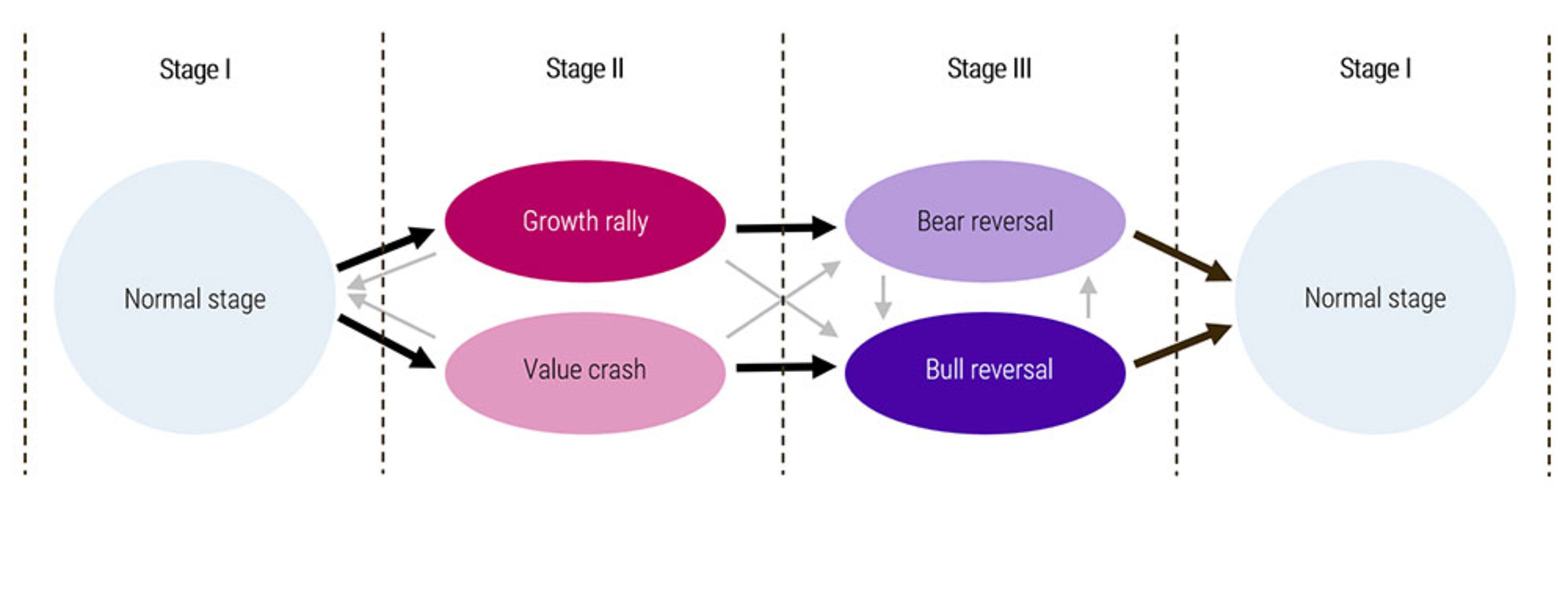 As summarized in Figure 1, the quant cycle consists of three stages, with the ‘normal’ stage being most common. This tends to be disrupted by large drawdowns of the value factor, due to either rallies of growth (expensive) stocks or crashes of their value (cheap) counterparts, which are in turn followed by reversals. Finally, there is a return to normality.