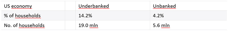 Dit is ook het geval in de VS, zoals blijkt uit een onderzoek van de Federal Deposit Insurance Corporation (FDIC) uit 2023 om in kaart te brengen wie geen bankrekening heeft (banklozen) of wel een rekening heeft maar gebruikmaakt van alternatieve financiële diensten (beperkte toegang tot bankdiensten). De resultaten zijn weergegeven in onderstaande tabel.
