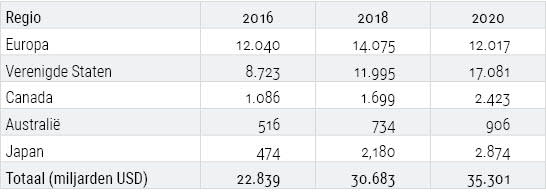 Figuur 2: De toename van wereldwijde duurzame beleggingen van 2016 tot 2020 in biljoen USD